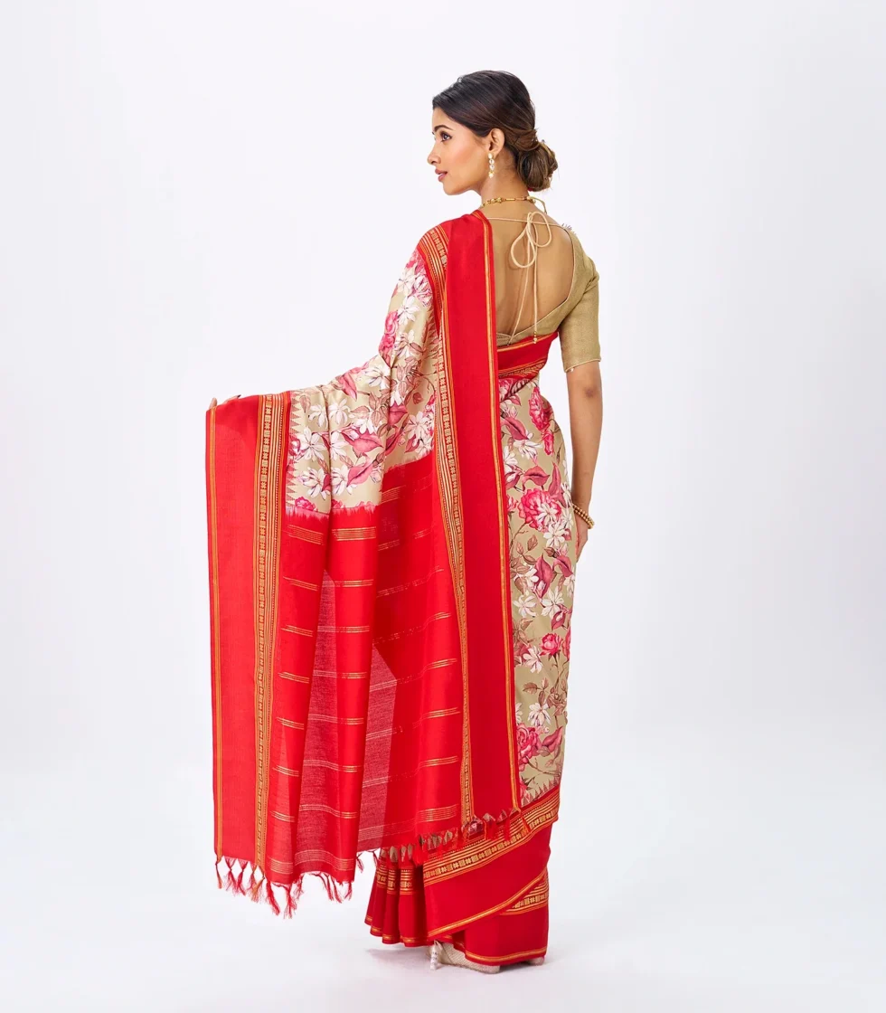 Beige Handloom Silk Saree With Printed Floral Motifs & Red Border