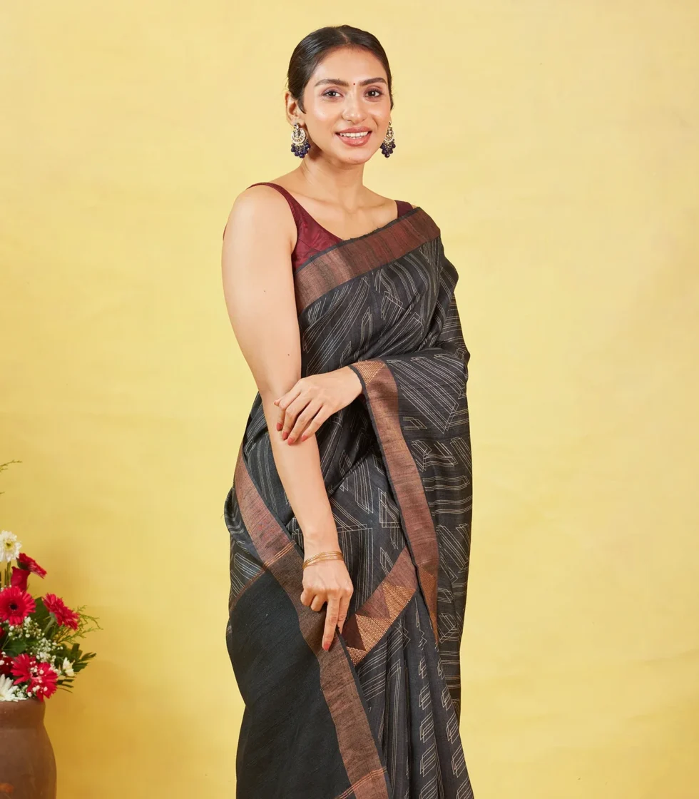Elevate your wardrobe with the understated elegance of this handwoven Tussar silk saree. Crafted from pure Tussar silk, it features striking printed stripe motifs across a rich black body, beautifully complemented by a double side equal border and matching pallu. Lightweight yet luxurious, this saree with geometric design elements is perfect for both festive occasions and sophisticated everyday wear.