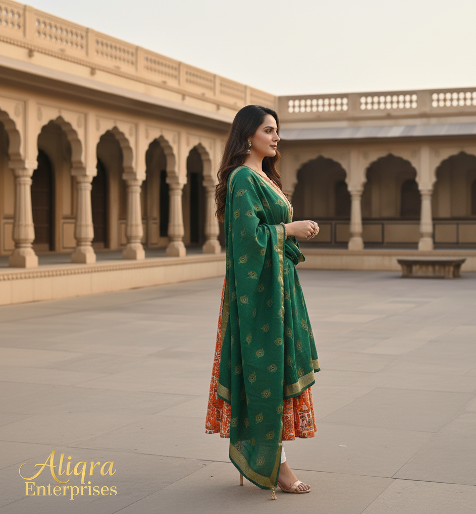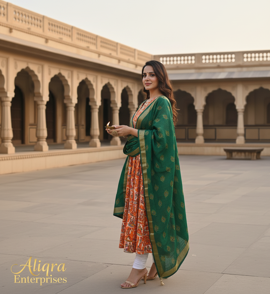 Orange & White Printed Anarkali Kurti Celebrate in style with our stunning Orange & White Printed Anarkali Kurti, featuring a vibrant festive print and a gorgeous peacock green dupatta. This elegant set, complete with white leggings and a chic back design, is perfect for any special occasion. Experience the perfect blend of tradition and modern flair with Aliqra Enterprises’ exquisite ethnic wear.