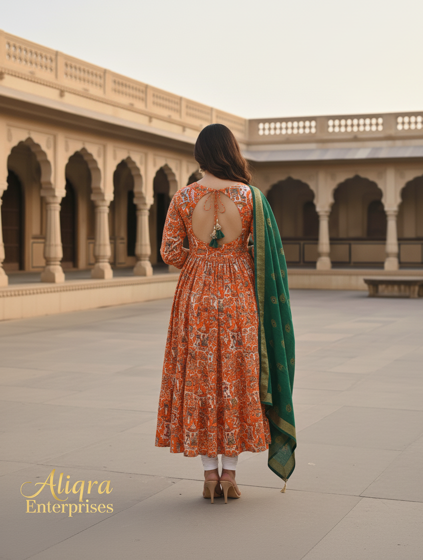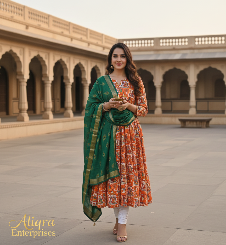 Embrace Festive Splendor with Aliqra Enterprises’ Orange & White Printed Anarkali Kurti