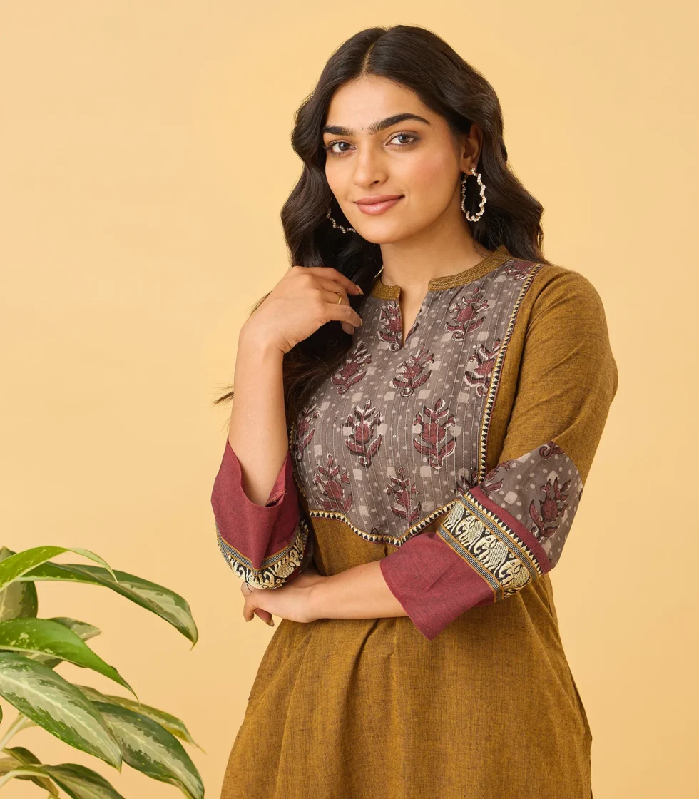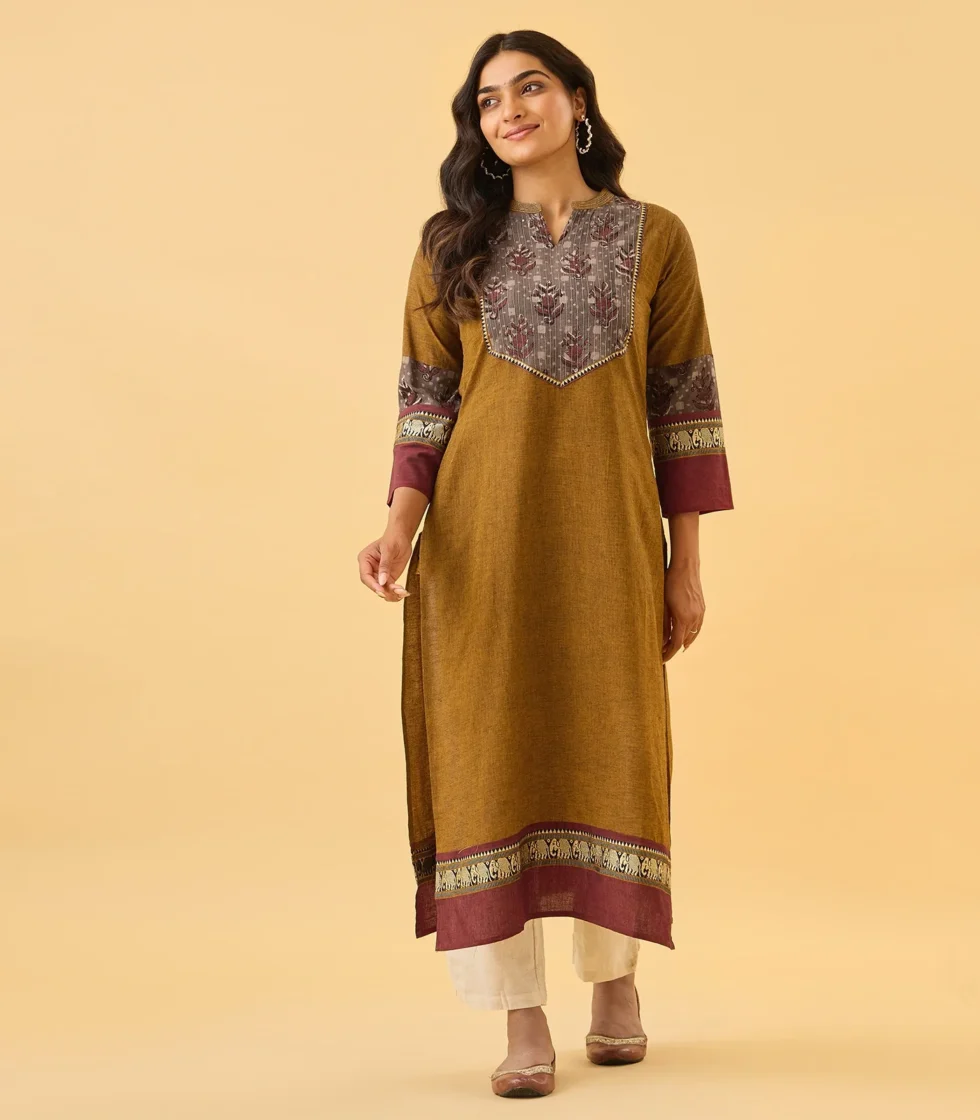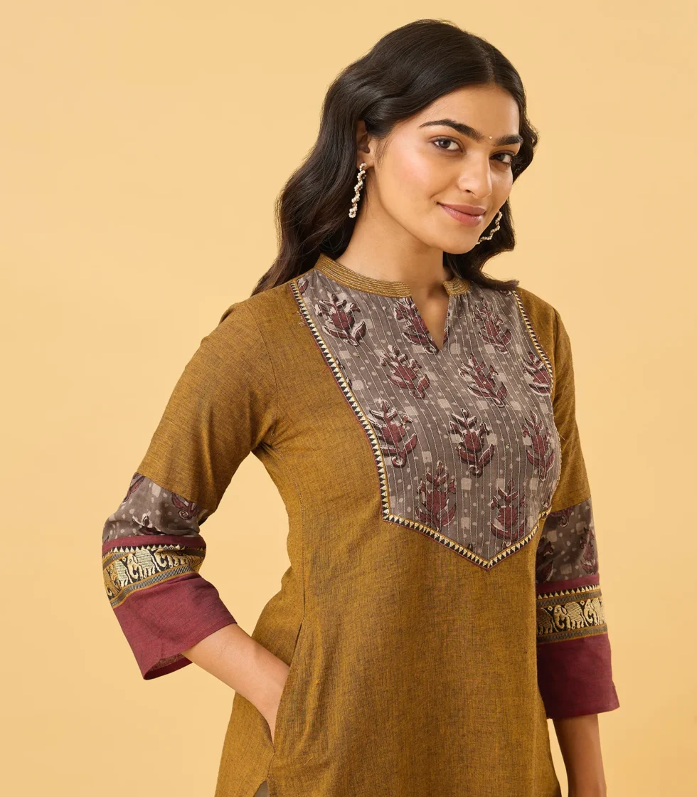 This chic top features a mandarin collar neckline with a grey printed fabric front yoke, adding a touch of elegance. The 3/4th sleeves come with intricately woven contrast border detailing, enhancing the overall design. Crafted in a straight-cut silhouette, it offers a modern and comfortable fit for various occasions.