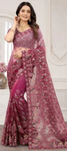 Luxurious Rose Pink & Maroon Embroidered Net Saree