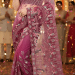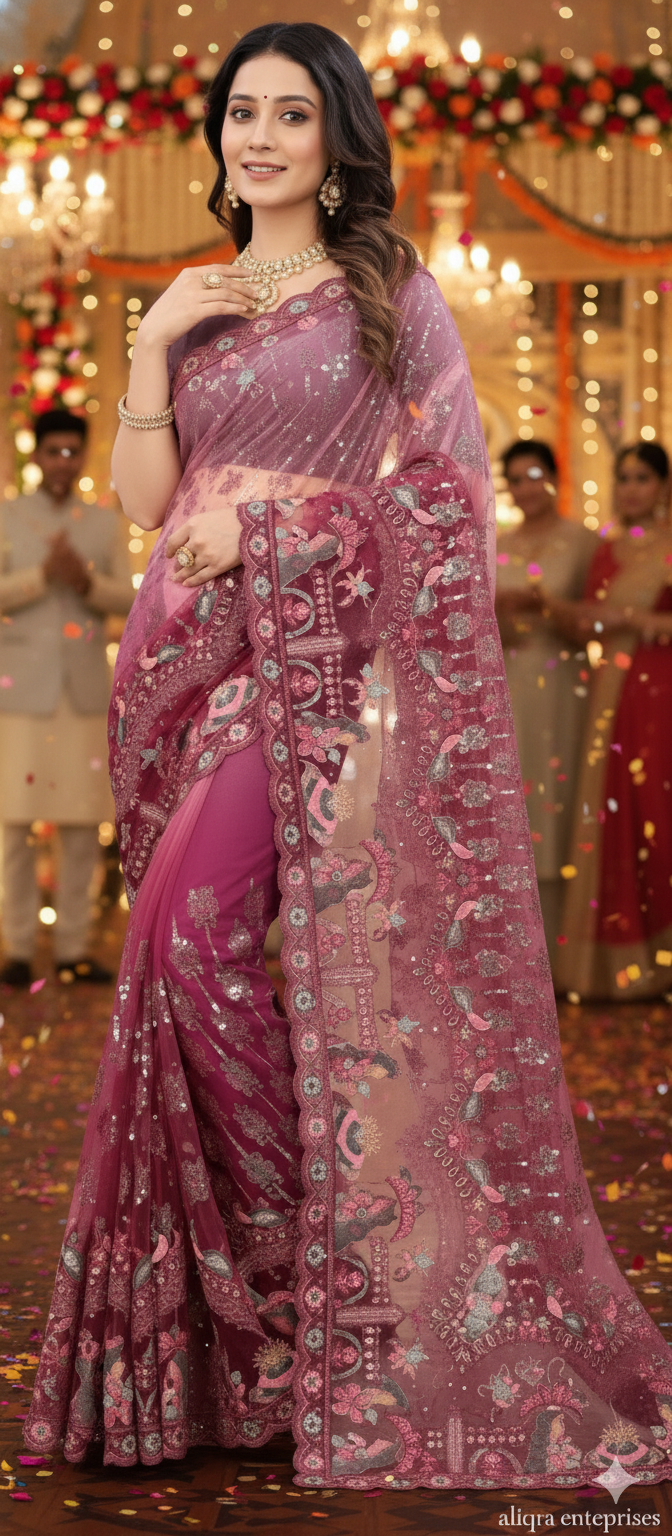 Drape yourself in the ethereal beauty of this designer net saree, perfect for making a dazzling statement at any wedding, reception, or festive occasion. This magnificent piece showcases a stunning gradient of rose pink transitioning into deep maroon, creating a captivating visual depth.