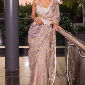 The entire saree is adorned with intricate, heavy-duty thread and sequin embroidery, featuring detailed floral and traditional motifs that catch the light beautifully. The border is meticulously finished with dense needlework, providing a rich, opulent frame. Paired with a matching embroidered blouse, this saree promises an elegant and unforgettable look that celebrates traditional craftsmanship with a contemporary flair.