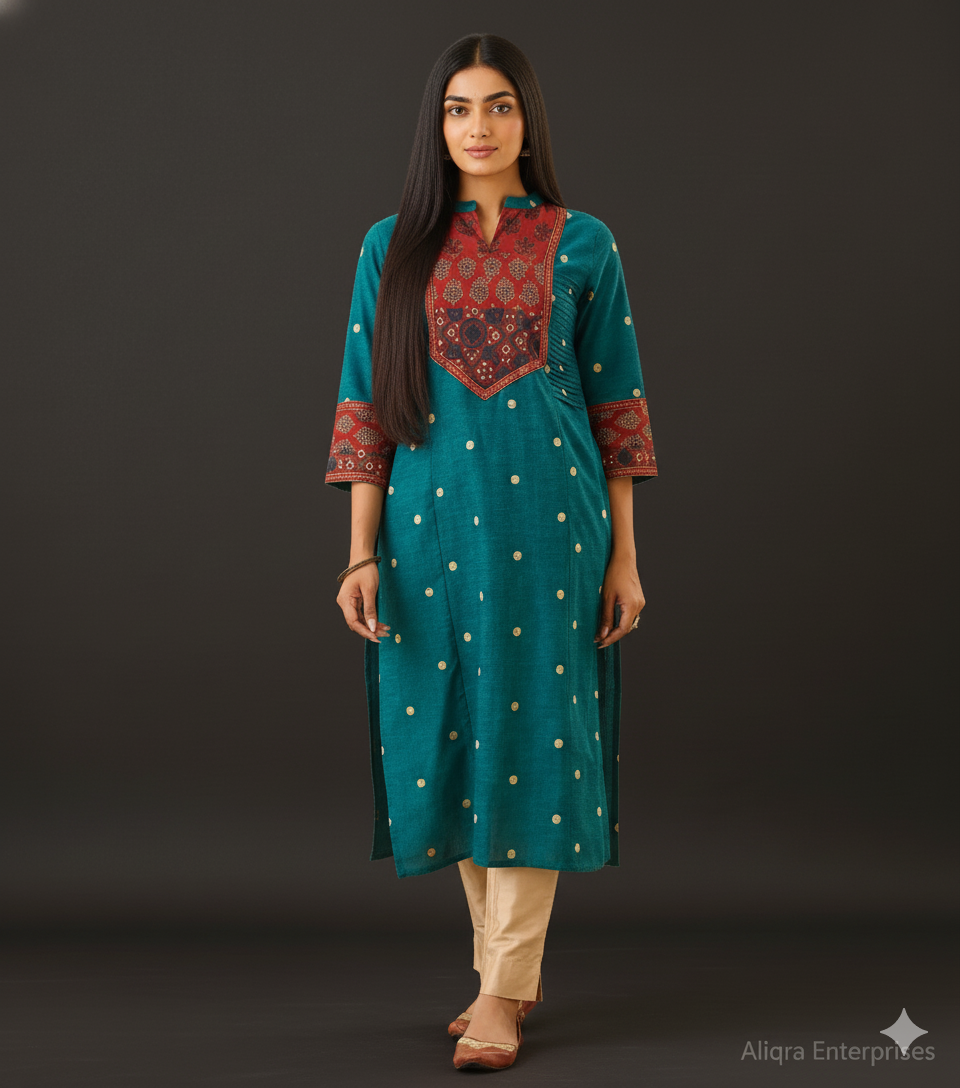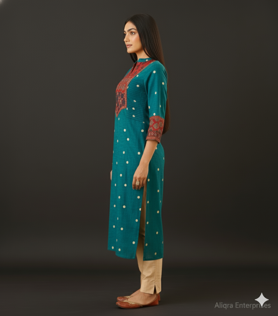 Elegant straight-cut top featuring a Mandarin collar, stylish 3/4th sleeves, and unique Ajrakh-inspired print detailing. Crafted from charming teal polka dot woven butta fabric for comfort and flair.