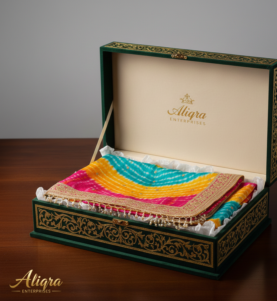 Authentic Craftsmanship & Thoughtful Gifting: Each Leheriya pattern is a testament to skilled artistry, reflecting the rich cultural tapestry of Rajasthan. Aliqra Enterprises ensures premium quality, and this dupatta comes encased in our elegant branded box, making it a wonderful and authentic gift.